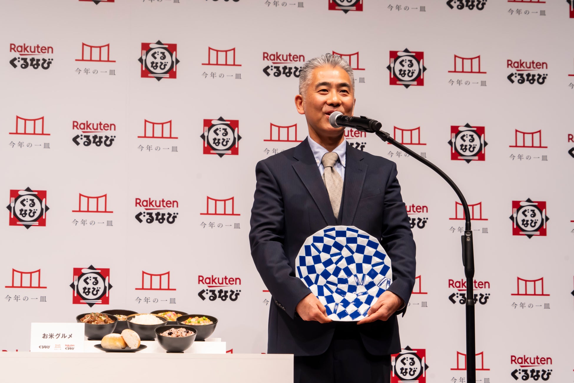 発表会では、小池精米店 三代目店主であり、五ツ星お米マイスター、東京米スター匠でもある小池理雄氏に登壇いただき、株式会社ぐるなび 取締役会長・創業者「今年の一皿®」実行委員会 委員長 滝久雄より、記念品を贈呈しました。小池氏は、「お米グルメの普及に関わる皆さんを代表して、受け取らせていただきました。お米に携わるようになって20年近く経ちますが、このような日がくるとは思っていませんでした。本当に感無量です」とご挨拶されました。