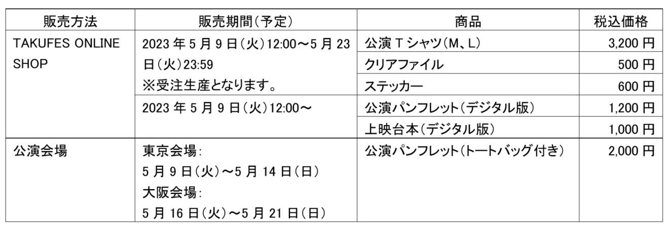 さらに、毎公演の来場者4名様に、非売品公演グッズがプレゼントされるお楽しみ企画も決定!チケット先着販売中のため、お買い求めはお早めに!ぜひ、「TAKUFES ONLINE SHOP」をご覧ください。