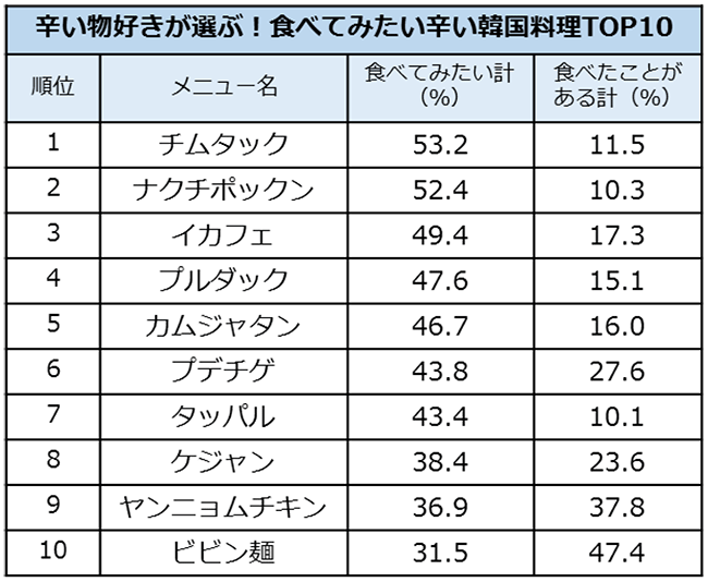 『ホットペッパーグルメ外食総研』がピックアップした「辛い韓国料理」18品目の中から、辛い料理が「好き」「どちらかといえば好き」と答えた555人の回答を基にランキングを作成しました。「食べてみたい」が一番多かったのは「チムタック」(53.2%)。チムタックは鶏肉とサツマイモ粉から作る韓国春雨などを煮込んだ料理で、甘辛いタレが後を引くおいしさです。そのほか、手長タコを唐辛子味噌とニンニクで炒めた激辛料理「ナクチポックン」(52.4%)が2位、激辛ソースに漬け込んだ鶏肉を焼いた「プルダック」(47.6%)が4位、豚の背骨とジャガイモを辛く煮込んだ「カムジャタン」(46.7%)が5位に入りました。