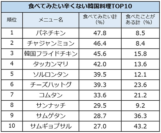 ■辛くない韓国料理で食べてみたい1位は「パネチキン」