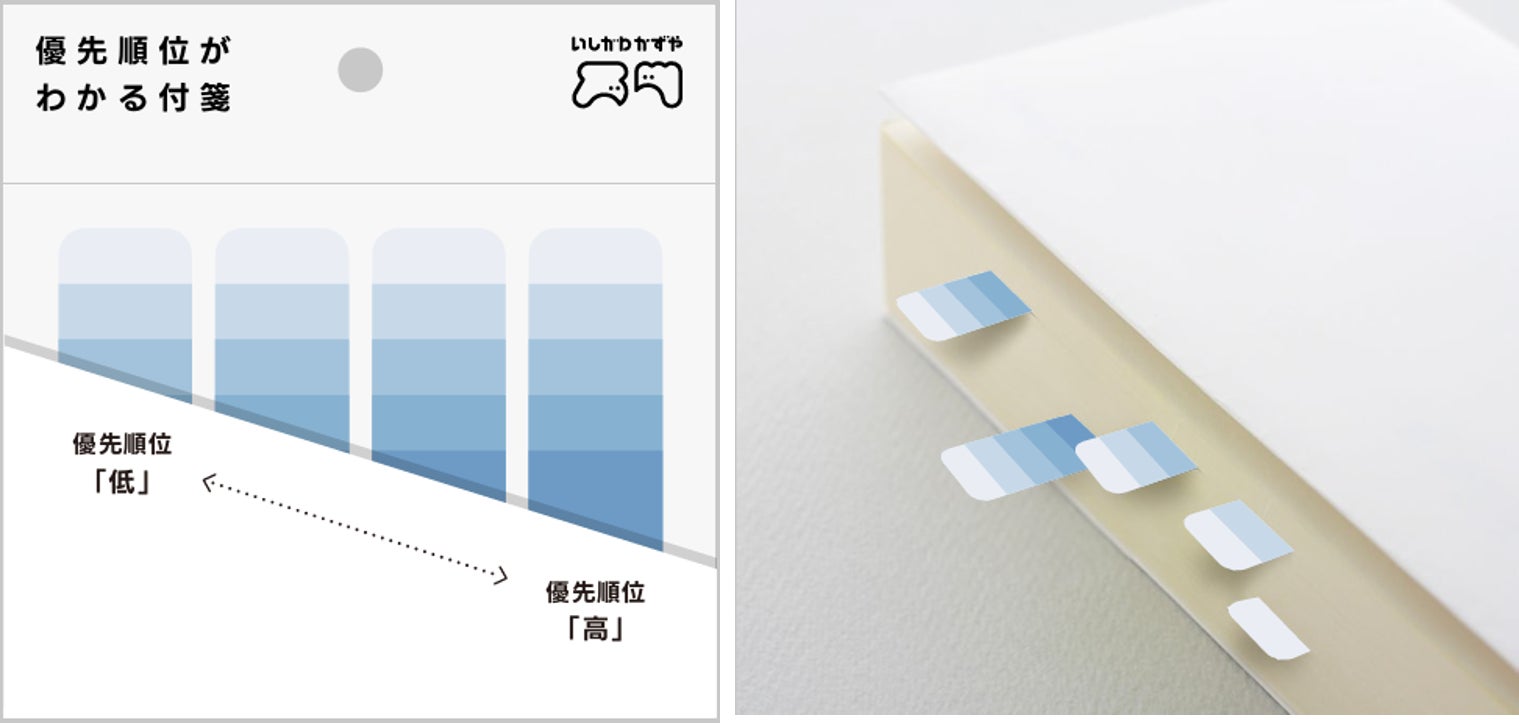 アイデアクリエイター・いしかわかずや氏によって生まれた付せん。カラーが5段階になっており、貼る位置によって色の濃さが変わるため優先順位が一目で分かります。全4色。※3月中旬以降順次入荷予定