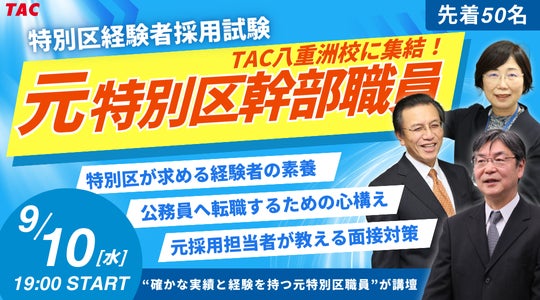 資格の学校TACは、9/10(水)に、R7年度:特別区(経験者採用)を受験される皆様に向けて、最難関2次:口述(面接)試験突破の足がかりとなる特別イベントを実施いたします。