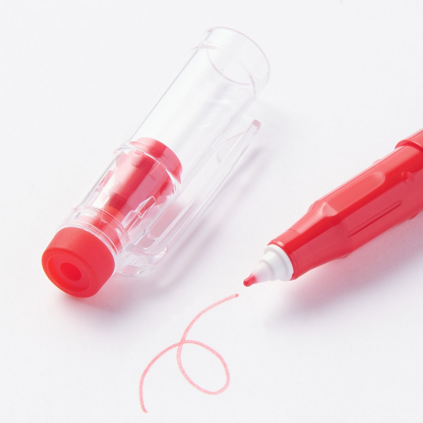 筆圧をかけずに軽い力で書くことができる水性カラーペンです。先端にプラスチック素材のチップを使用したペン先は丈夫でつぶれにくく、最初から最後まで同じ線幅で細書き筆記が可能です。手帳やノート、書類への書き込みや校正作業、イラスト描きなどにおすすめです。