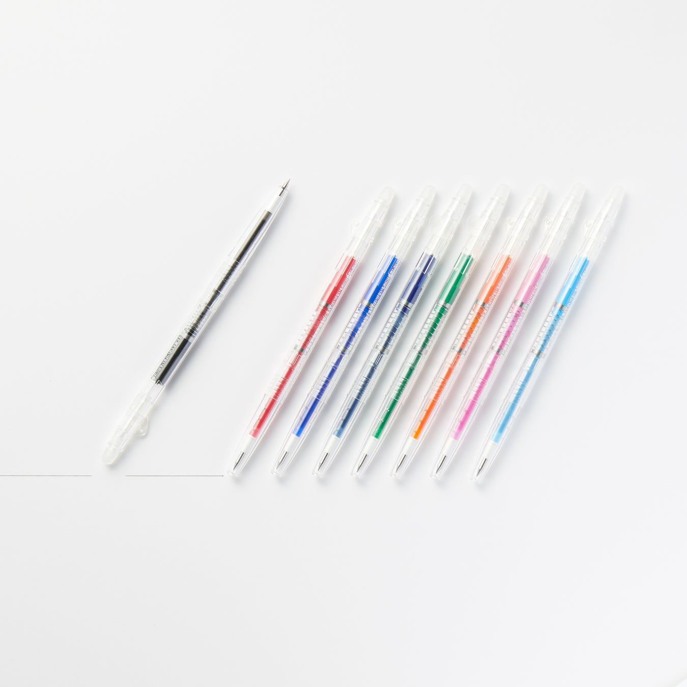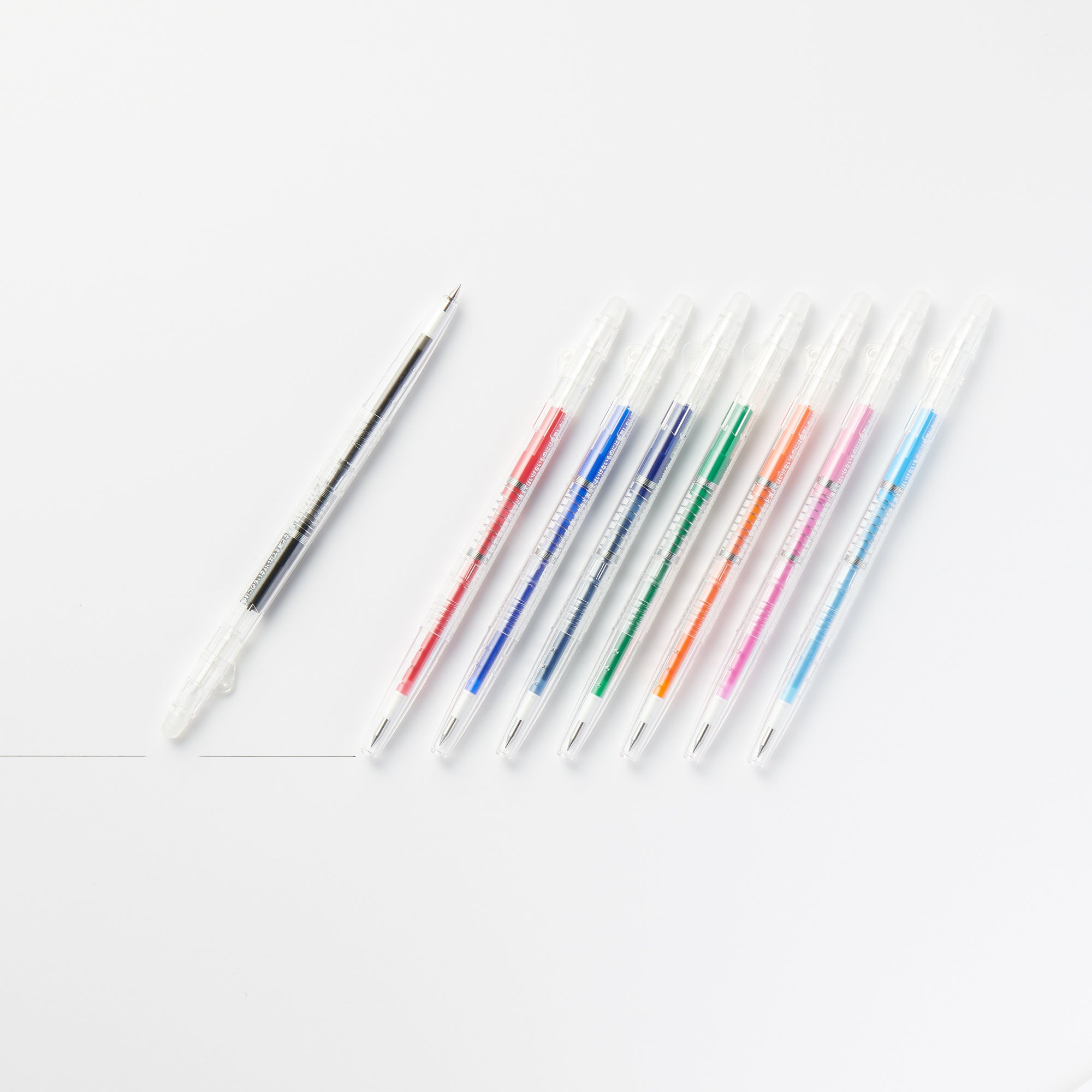 ノック式のスリムボールペンは、ペンケースに複数本入れてもかさばりにくいようクリップをなくしました。0.38mmと0.5mmの2種類のボール径で、0.38mmは8色、0.5mmは4色展開です。
