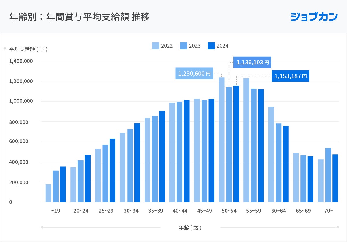 年齢別に年間賞与平均支給額の推移を見ると、支給額が最大値となったのは各年「50~54歳」という結果になりました。2024年における50~54歳の平均支給額は「1,153,187円」となりましたが、2022年の「1,230,600円」からは下降しています。