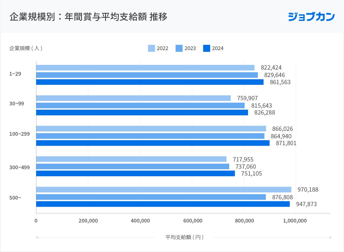 企業規模別に年間賞与平均支給額の推移を見ると、2024年では従業員数が「500人以上」企業の年間賞与平均支給額が「947,873円」と一番高く、「300~499人」規模の企業の支給額が「751,105円」と一番低い結果となりました。