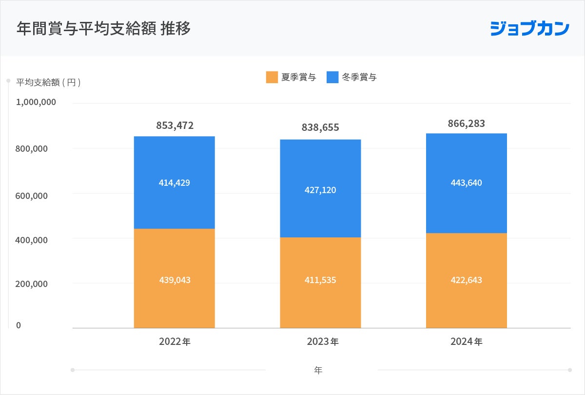 ・2024年の年間賞与平均支給額は「866,283円」、2023年比「3.2%」の増加