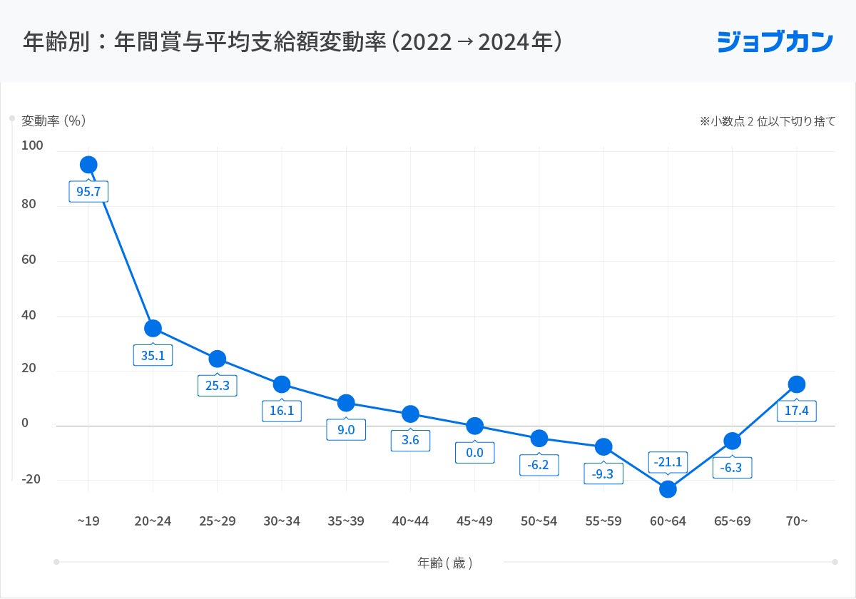 2022年から2024年にかけての変動率を年齢別に見ると「40~44歳」までは上昇傾向、「45~49歳」で停滞し、「50~69歳」の年代は下降傾向にあり、70歳以上は上昇傾向に戻ります。