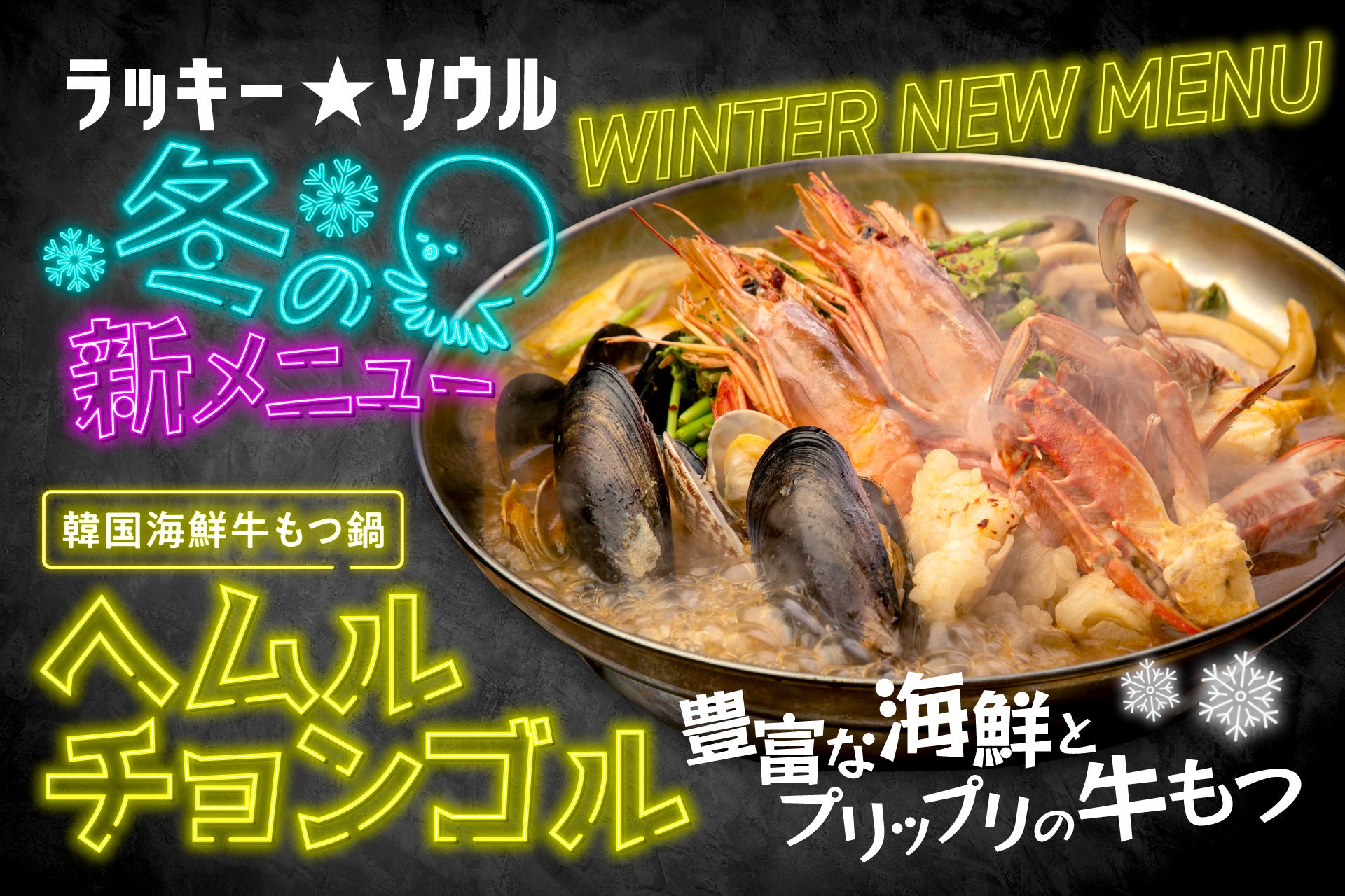 『韓国大衆酒場 ラッキーソウル』では、寒い冬を乗り切る辛味の効いた「韓国鍋」をはじめ、スタミナ満点の牛もつを使用した2種の新作冬メニューをスタートいたします。