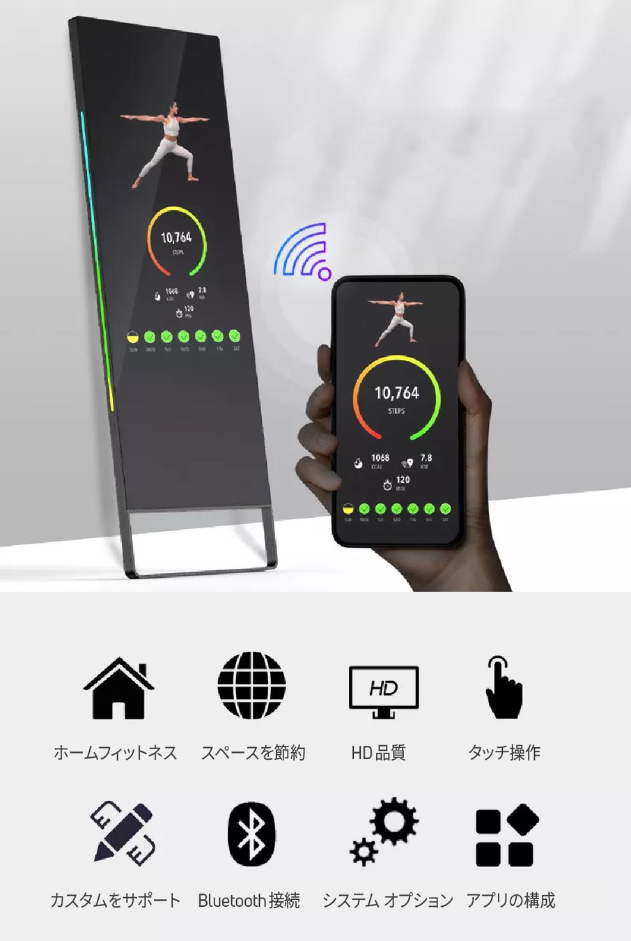 4.フィットネス距離:より良いエクササイズを体験していただくために、ミラーの正面から約1.5mの距離で使用することをお勧めします。