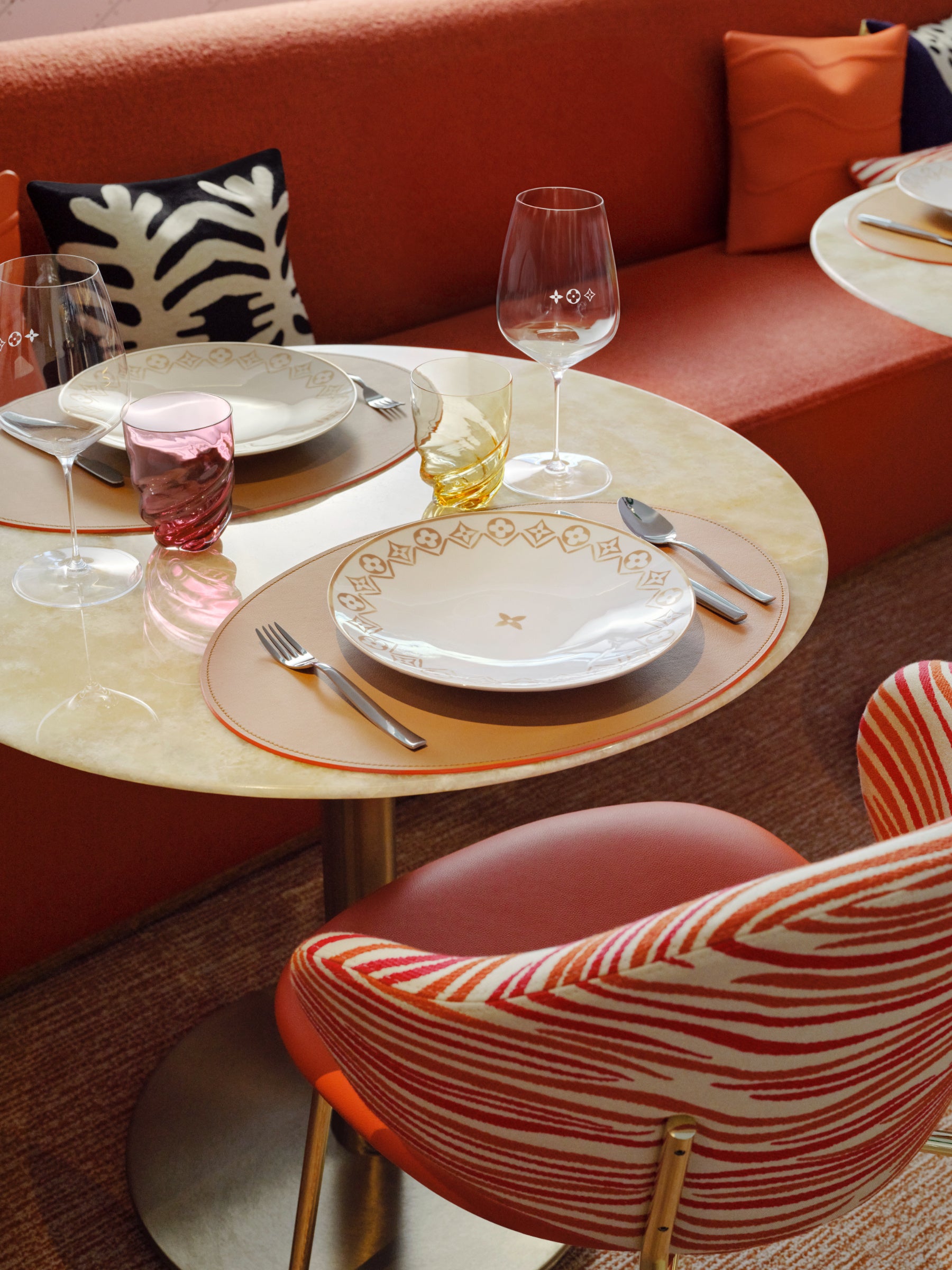 この近未来のパビリオンとでも言うべき開放感溢れる空間では、ウィメンズの世界観を楽しめるアイテムをはじめ、メンズ·アクセサリーやレザーグッズをご覧いただけます。カフェはストア内でシームレスにつながり、カウンター席とテーブル席を用意。空間に馴染んだ曲線的なインテリアが落ち着きを与える一方で、カフェは遊び心と洗練された雰囲気も感じさせ、空港の絶え間ない人の流れの中であらゆるトラベラーを歓迎する環境を生み出しています。明るい店内は、オレンジやゴールドのトーンがアクセントとなり、温かみと活気ある雰囲気に。頭上には「オブジェ·ノマドコレクション」の1つであるアトリエ·オイが手掛けた、カラフルな羽根を広げて舞う鳥を彷彿させる装飾用モビール「ケツァール」のシリーズを展示。レザーのテーブルマットやゴールドカラーのモノグラムで縁取られたテーブルウェア、鮮やかな「ツイスト·グラス」が、ルイ·ヴィトンの美しいテーブルセッティングのビジョンを余すところなく表現しています。