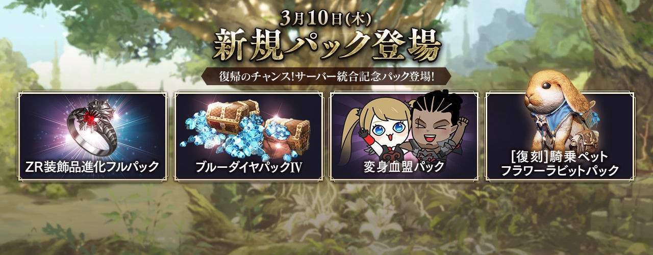 サーバー統合の実施にあわせて、ブルーダイヤが有料と無料合わせて8,000個獲得できる「ブルーダイヤパックⅣ」や、装飾品をZR進化できる素材がフルに詰まった「ZR装飾品進化フルパック」など、大変お得な新パックを多数追加いたしました。