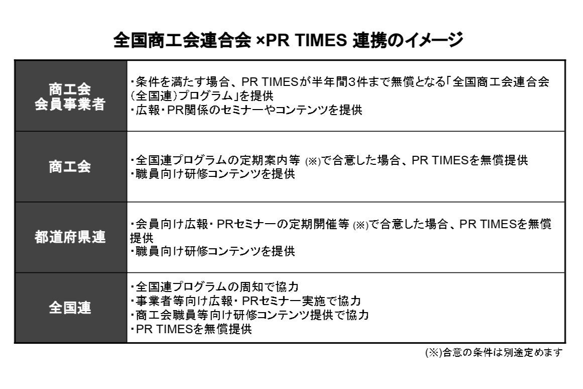 商工会の会員であり、かつ下記の条件を満たす各事業者に対し、それぞれ開始を希望する日から6カ月間、計3件まで無料で「PR TIMES」でプレスリリース配信いただける「全国商工会連合会プログラム」を提供します。