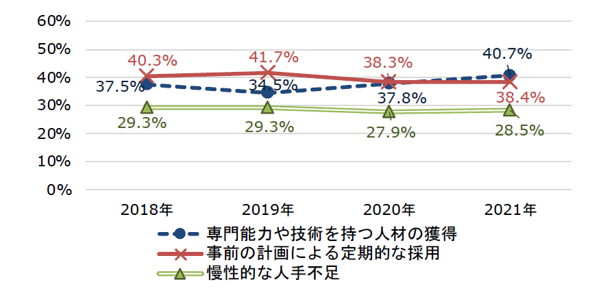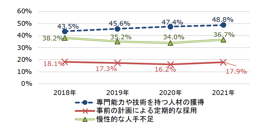 - 採用理由は「新卒」「中途」ともに「専門能力や技術を持つ人材の獲得」が最多に【図2、3、4】