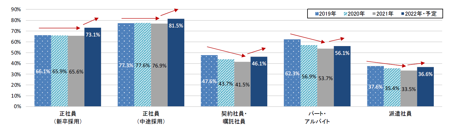 一方、2022年の採用予定割合はいずれの雇用形態においても、2021年の採用実績割合より増加した。今後の新型コロナウイルスの感染状況によるが、経済活動が回復すれば、また人材ニーズも回復してくると思われる。【図1】