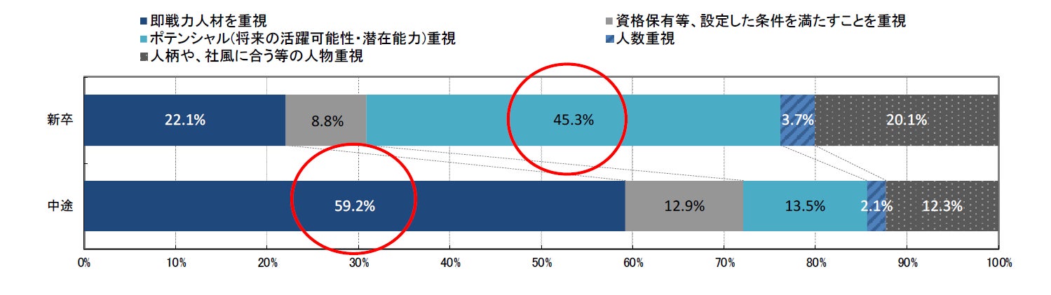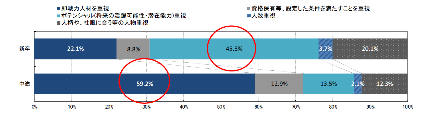 雇用形態別で採用の理由を見ると、「新卒」「中途」ともに、「専門能力や技術を持つ人材の獲得」が最多となった。これまで「新卒」は「事前の計画による定期的な採用」が最多だったが、徐々にその割合は低下し、「専門能力や技術を持つ人材の獲得」と逆転した。個人の専門的なスキルや能力に注目する志向が高まりつつあるようだ。しかし、「採用スタンス」を聞くと、「新卒」では「ポテンシャル重視」が最多で45.3%、「中途」では「即戦力人材を重視」が最多で59.2%となった。同じ「専門能力や技術を持つ人材」という観点でも、「新卒」は「将来的に戦力となること」が求められ、「中途」は「今、戦力である」ことが求められるようだ。【図2、3、4】