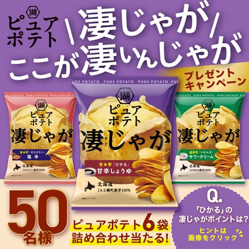 株式会社湖池屋(社長:佐藤章)は、国産100%の生じゃがいもを肉厚にスライスすることで「芋本来の濃い旨み」を最大限に引き出したポテトチップス「ピュアポテト」ブランドより、“北海道産ブランドじゃがいも”3品種を使用した期間限定のポテトチップス「ピュアポテト 凄じゃが きたかむい×塩辛/ひかる×甘辛しょうゆ/マチルダ×サワークリーム」を、2025年11月10日(月)に全国のコンビニエンスストア先行、2025年11月17日(月)に全国のスーパーマーケット他一般チャネルで発売します。
