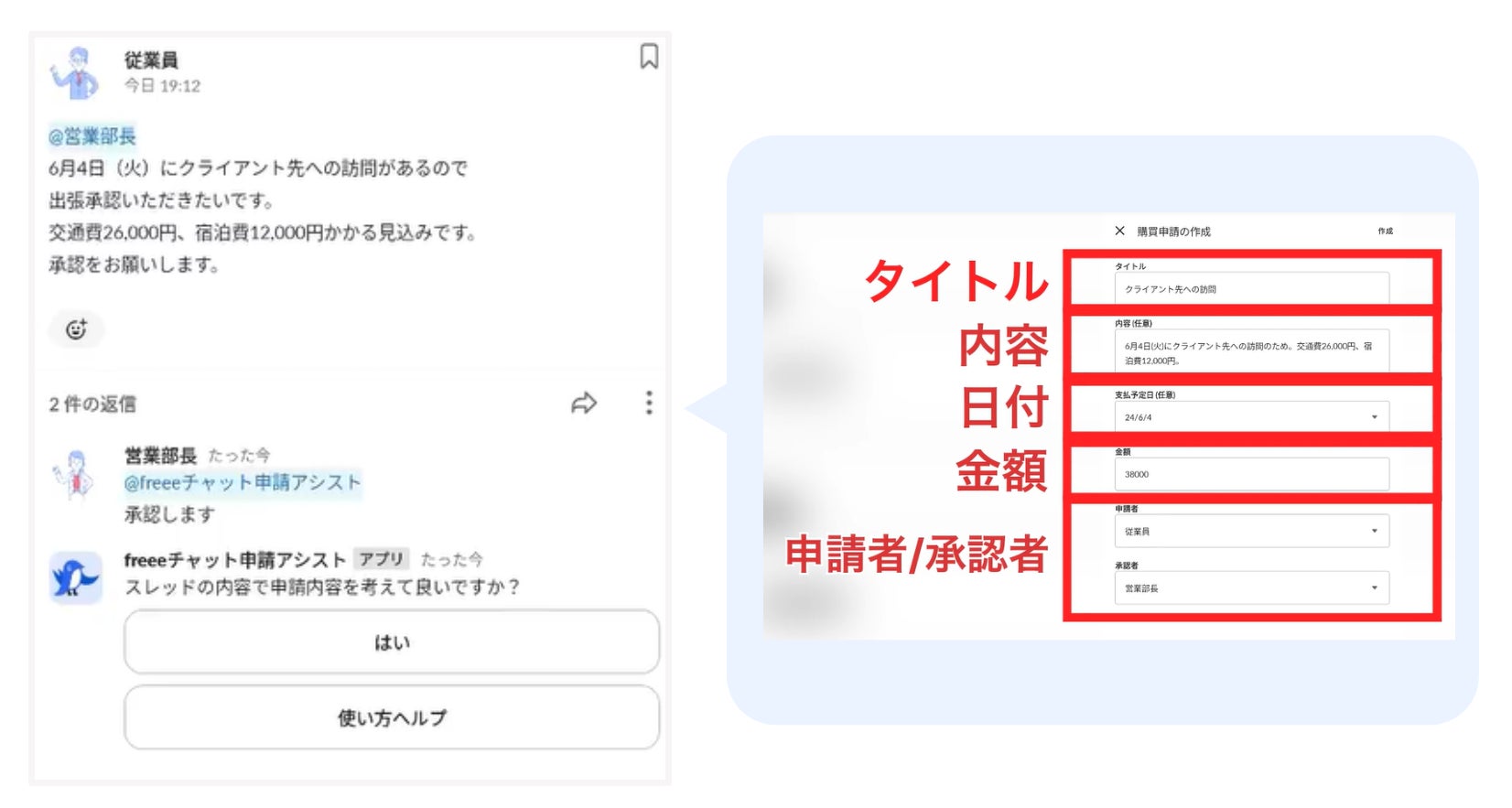 日常的に行われているチャットでのやり取りがそのまま自動的にfreee会計の購買申請に反映されるため、申請者や承認者が改めてfreee会計上で申請・承認する必要がなくなります。