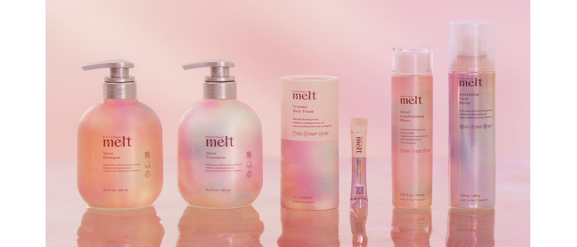 「melt」は、瑞々しくやわらかい、とろけるようなツヤ髪へと導くヘアケアブランドです。シリーズトータルで、音・泡・感触・香りのさまざまな感覚にはたらきかけ、休みながら美しく“休息美容”を提案しています。