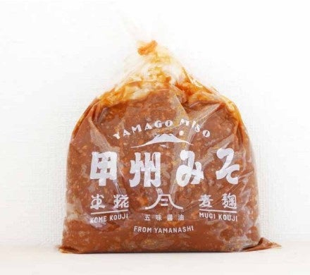 甘みと旨みのある麦味噌と、酸味とコクのある米味噌をミックス。創業から変わらない味で、地元の人々の食卓や郷土料理のほうとうを支えてきた山梨独自の地みそです。