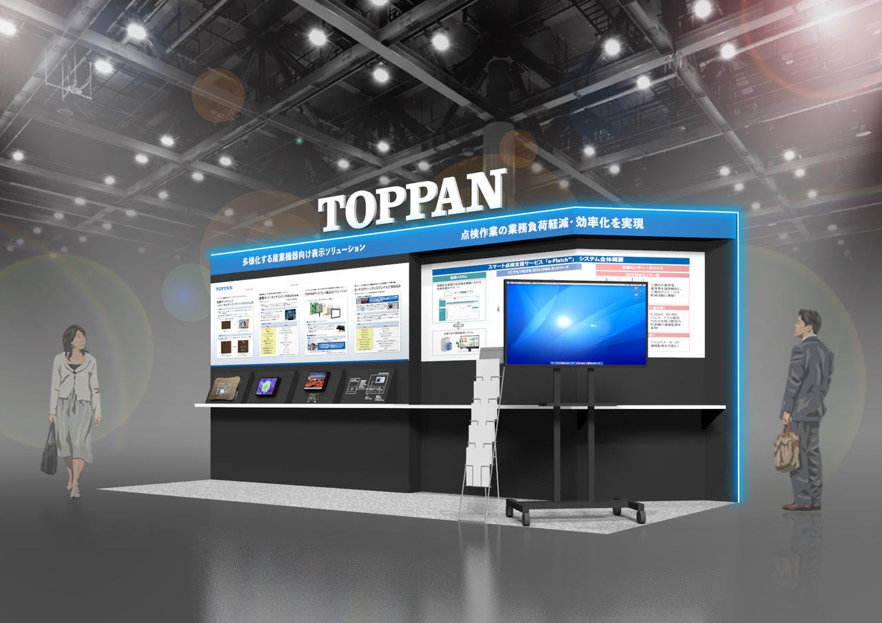 TOPPANブース(小間番号 11-5)では、工場・施設内に点在する計測器の遠隔監視、データ収集に特化した見える化アプリケーションを備えたスマート点検支援サービス「e-Platch™(イープラッチ)」、ディスプレイ周辺技術を一体化し、ユーザ設計リソースを大幅に削減する表示ソリューション、直接触ることなく操作可能な非接触タッチディスプレイ「静電ホバータッチディスプレイ」、内装デザインと調和する「加飾ディスプレイ」の活用シーンをイメージした展示を行います。