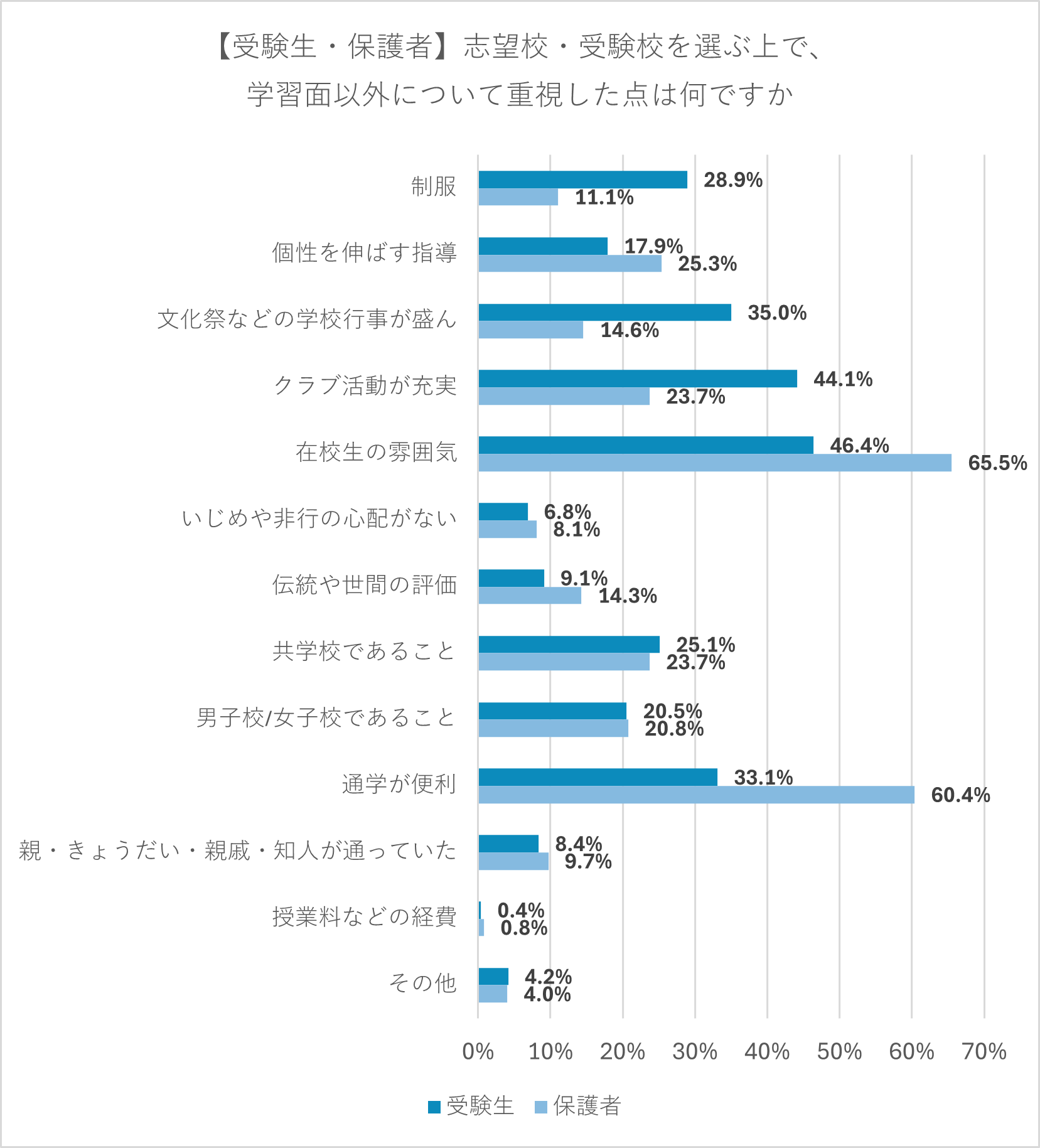 志望校・受験校を選ぶ上で、学習面以外について重視したポイントを、受験生・保護者にそれぞれ聞いた。