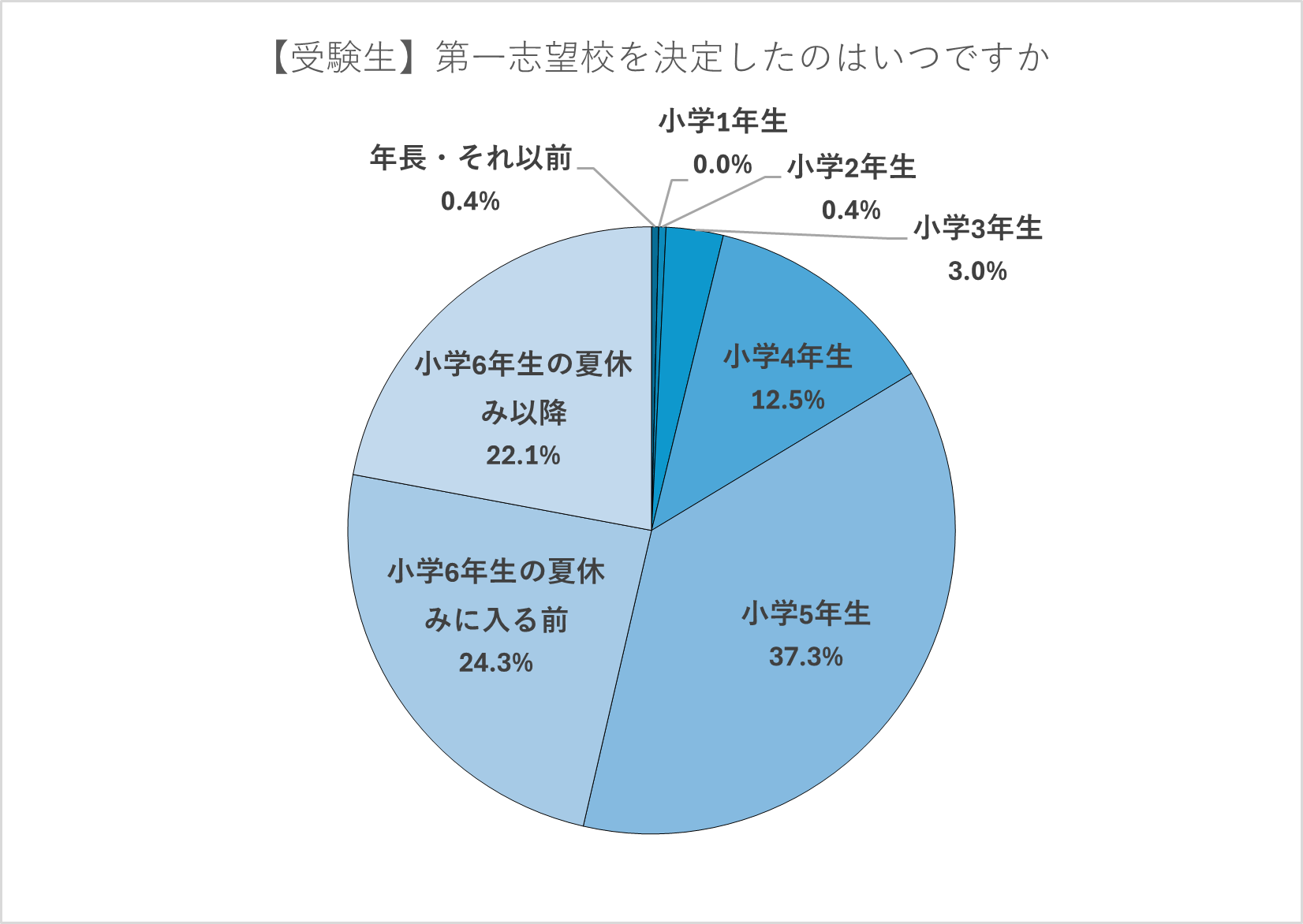 第一志望校を決めた時期を受験生に聞いたところ、「小学5年生」が37.3%と最も多かった。次いで「小学6年生の夏休みに入る前」が24.3%、「小学6年生の夏休み以降」が22.1%と続いた。受験生の3人に1人以上が小学5年生で第一志望校を決めたものの、小学6年生になってから志望校を決定した受験生も約半数であることが分かった。