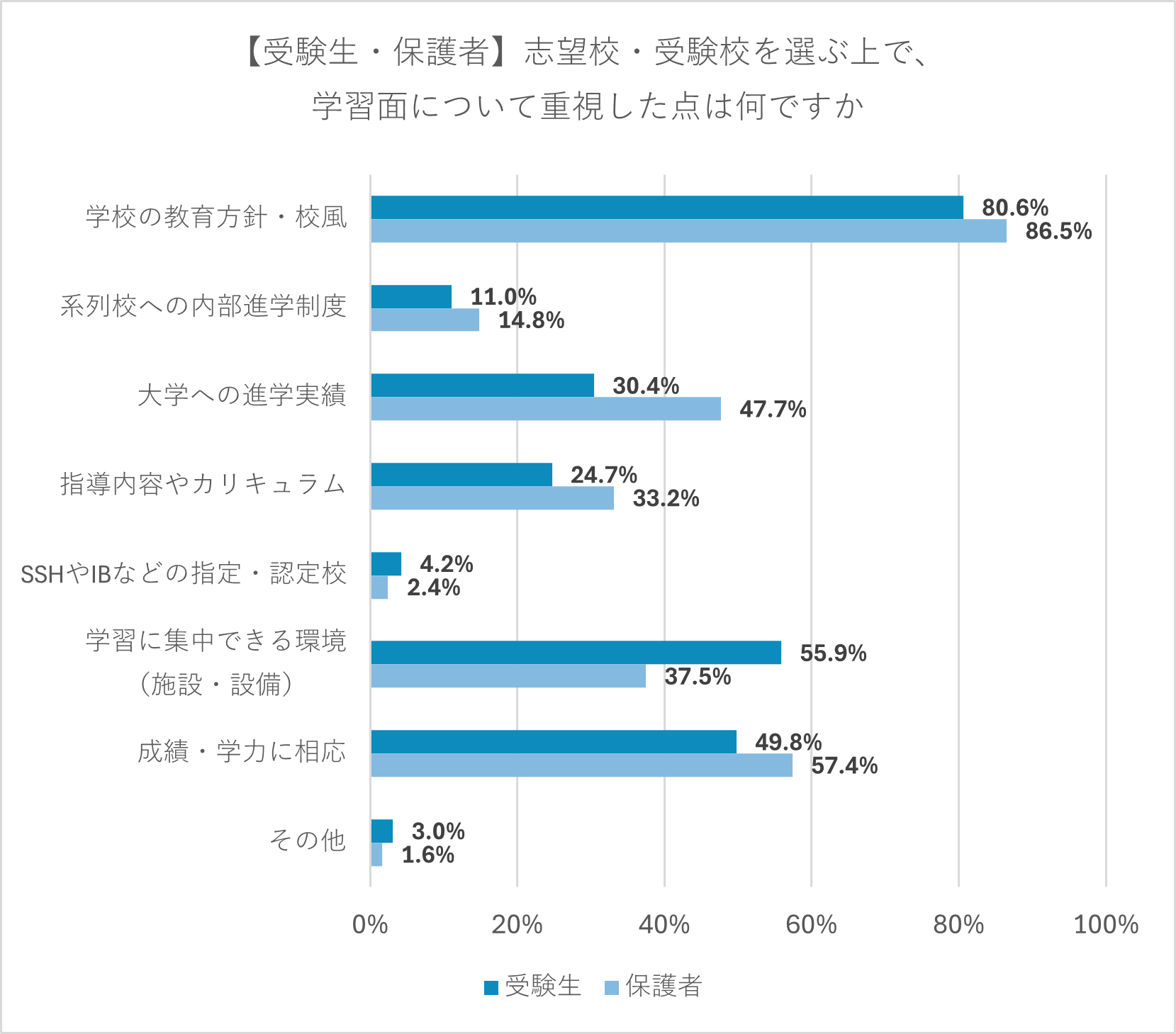 受験生・保護者ともに最も重視したポイントは「学校の教育方針・校風」で、受験生の80.6%、保護者の86.5%にのぼった。受験生と保護者の回答を比較すると、受験生は「学習に集中できる環境(施設・設備)」をより重視している一方、保護者は「大学進学への実績」「指導内容やカリキュラム」「成績・学力に相応」をより重視していることが明らかとなった。