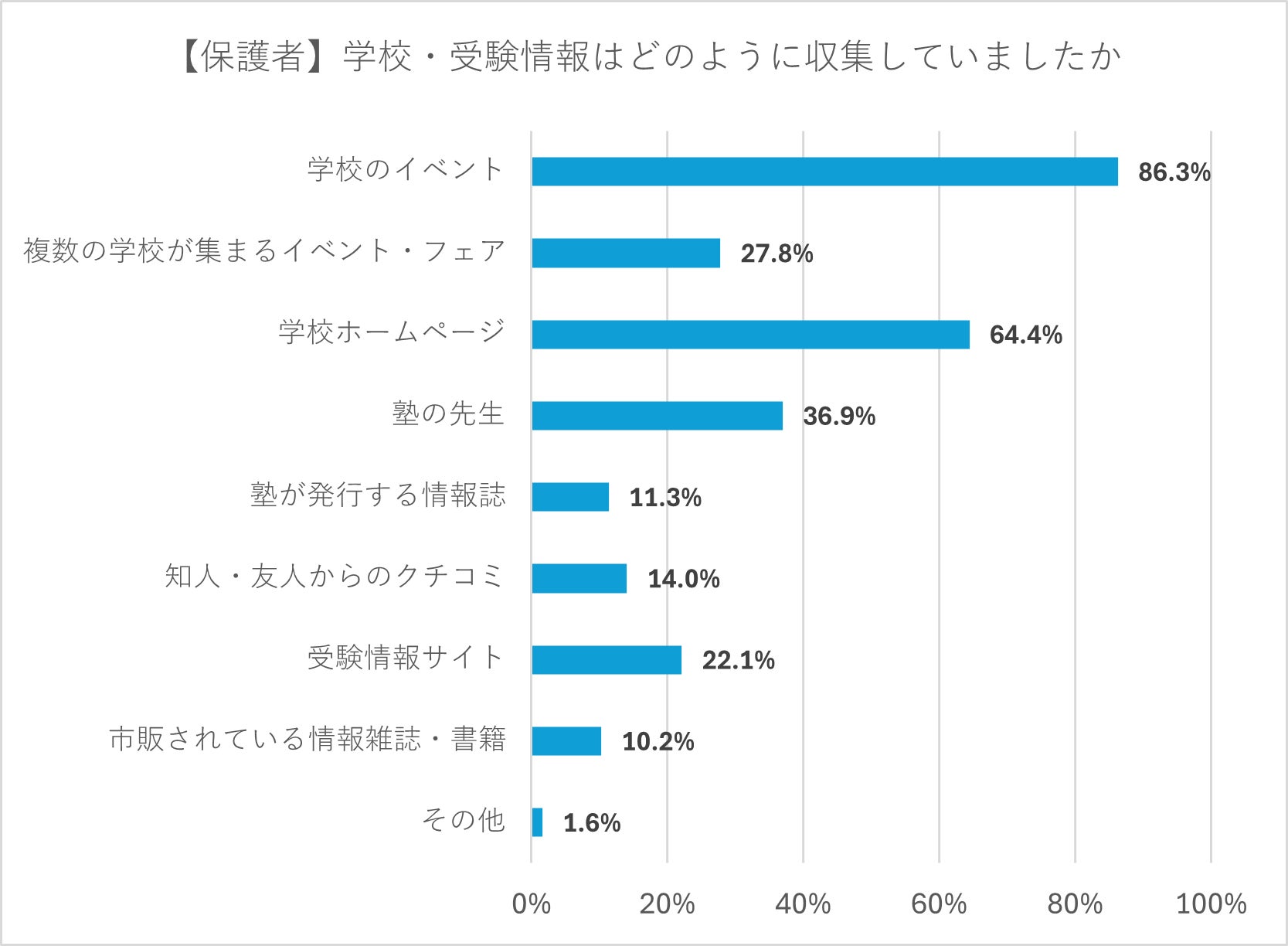 保護者に、学校や受験情報をどのように収集していたか聞いたところ、「学校のイベント」が86.3%と最も多く、次いで「学校ホームページ」が64.4%となった。多くの家庭で、学校が発信する情報を活用していることが分かった。