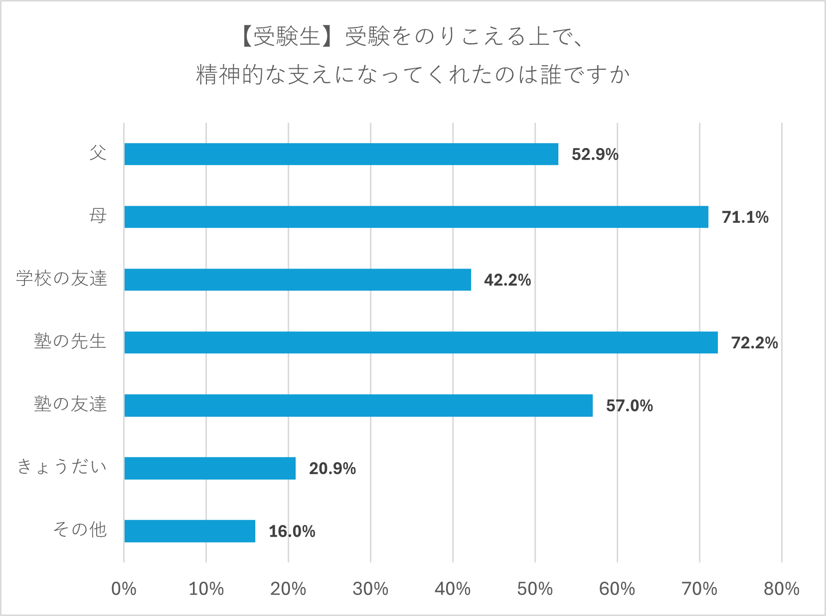 受験生に、受験をのりこえる上で精神的な支えとなった人を聞いたところ、「塾の先生」が72.2%と最も高く、次いで「母」が71.1%だった。受験生にとって、周囲の大人が支えとなっていることが分かった。