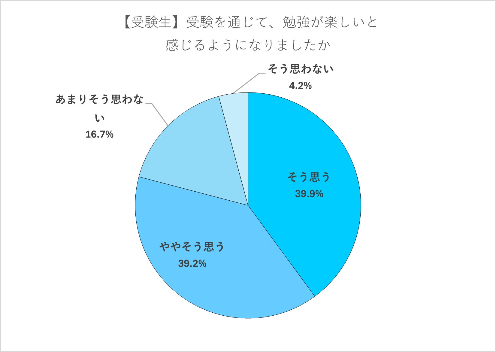 受験生に、受験を通じて勉強が楽しいと感じるようになったかを聞いたところ、「そう思う」が39.9%、「ややそう思う」が39.2%となり、約8割の受験生が、中学受験を通じて「勉強の楽しさ」を感じていることが分かった。