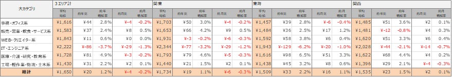 各エリアの平均時給について、関東エリアは1,734円(前年比19円増、前月比6円減)、東海エリアは1,509円(前年比33円増、前月比16円増)、関西エリアは1,535円(前年比23円増、前月比2円増)となりました。