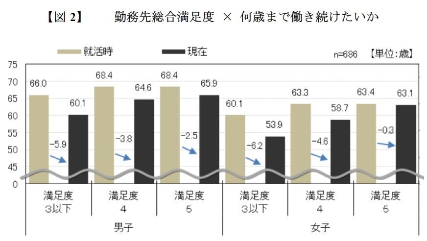 「『人生100年時代』が到来すると言われるが、あなたは何歳まで働き続けたいか」という質問について、就職活動時の2021年8月と入社後半年が経過した今回の調査時点で比較し、勤務先の満足度との関係を分析したところ、勤務先の満足度が3以下の場合、就職活動時より入社半年後の方が働き続けたい年齢がかなり低くなった(男子5.9pt減、女子6.2pt減)。入社後の勤務先満足度が低いと、人生を通して長く働き続けたいという意欲が、就活時よりも下がる傾向があると言える。【図2】
