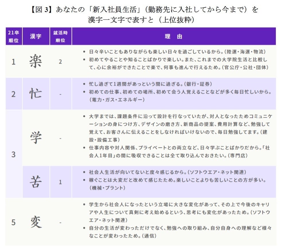 - 「新入社員としての生活」を漢字一文字で表すと1位は「楽」【図3】