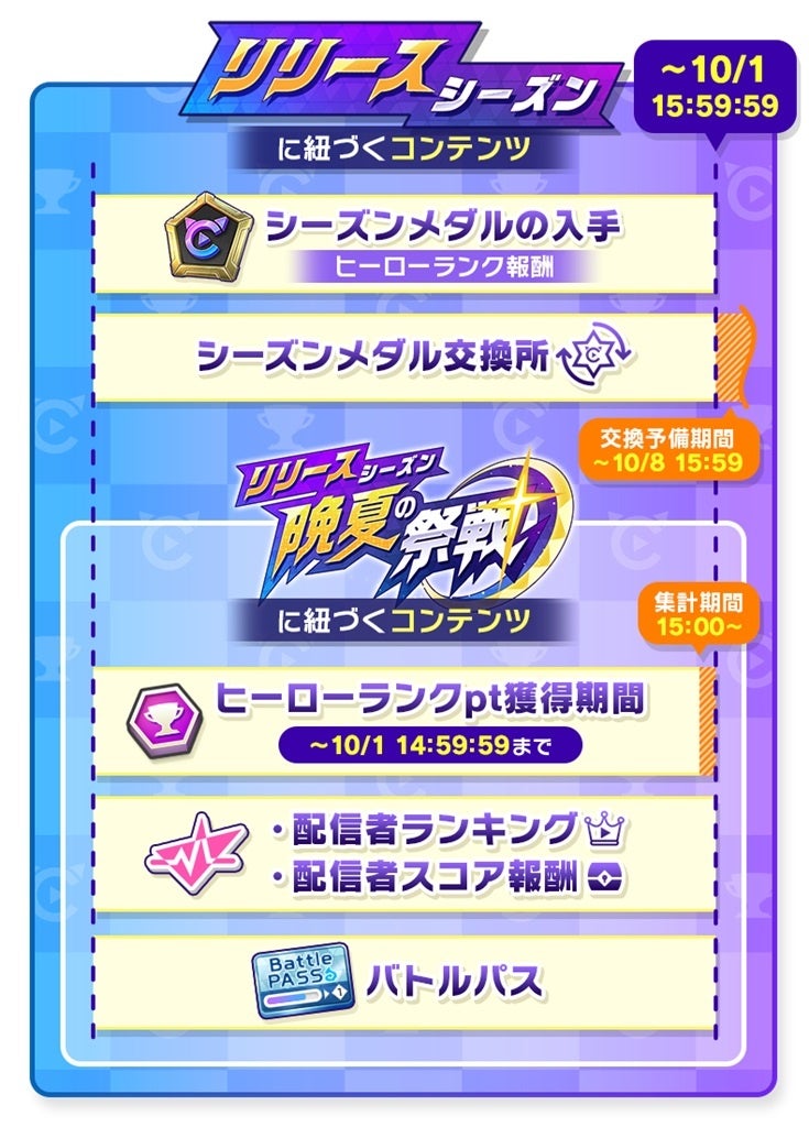 ランクマッチで貯まるヒーローランクptの集計や配信者ランキング&スコアの集計、バトルパスの実施など、リリースシーズンに合わせて様々な施策を開始しております。