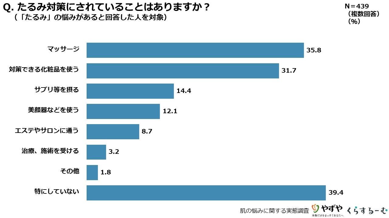 「たるみ」の悩みがある人に、たるみ対策の状況を聞いたところ(複数回答)、トップは「特にしていない」(39.4%)という結果になりました。次いで「マッサージ」(35.8%)、「対策できる化粧品を使う」(31.7%)が全体の3割を占めています。