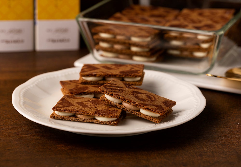 エチオピア産コーヒー豆から生まれるやさしい味わいの「コーヒーショコラ」と、欧州産マスカルポーネチーズを練りこんだコク深い「マスカルポーネショコラ」。きめ細かな泡でクリーミーに仕上げた2つのショコラを、ぷっくりしぼって交互に並べました。“喫茶店の世界”をココアパウダーで描いたザクザクの薄焼きクッキーで挟みこめば、『ティラミスショコラサンド』のできあがり。口の中でとろけてはじめて完成するティラミスの味わいをお楽しみください。