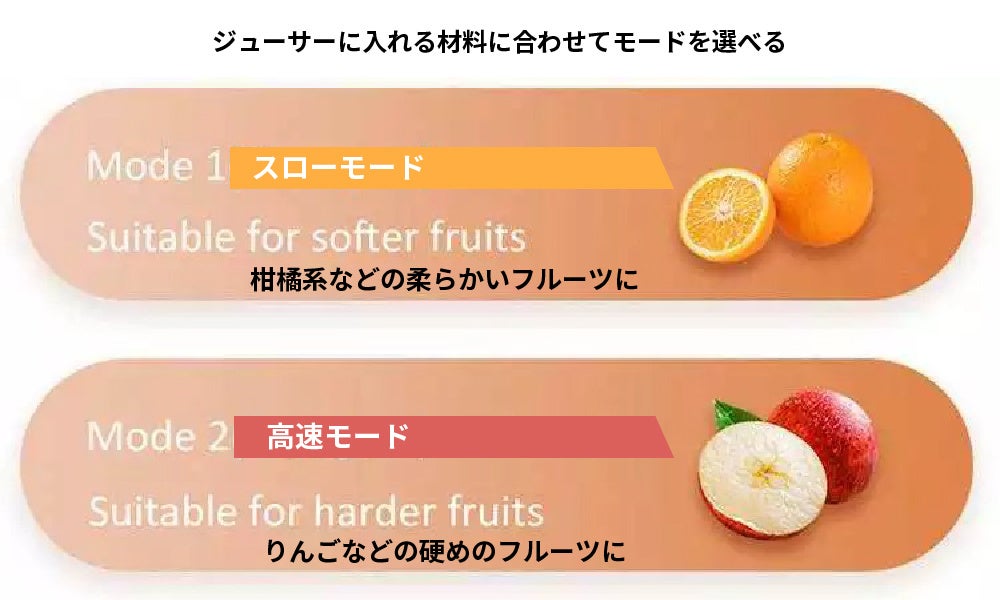 - 果物や野菜のタイプに合わせて選べる2モード