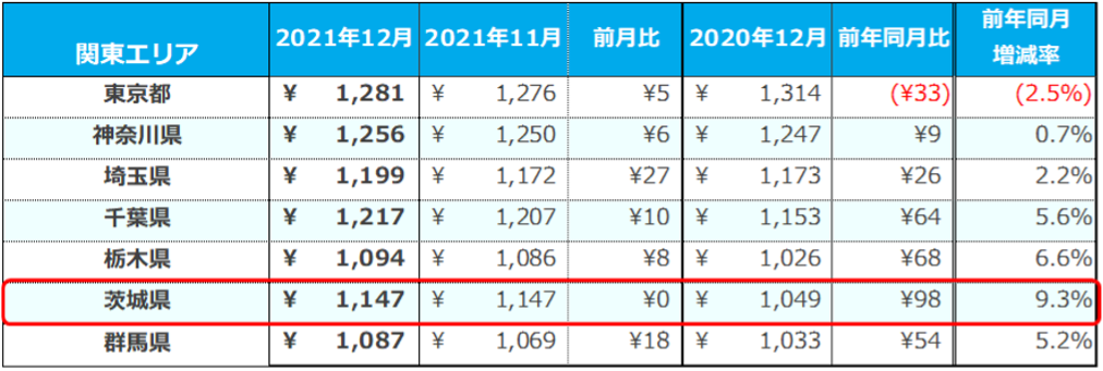- 茨城県 1,147円(前月1,147円、前年同月1,049円)