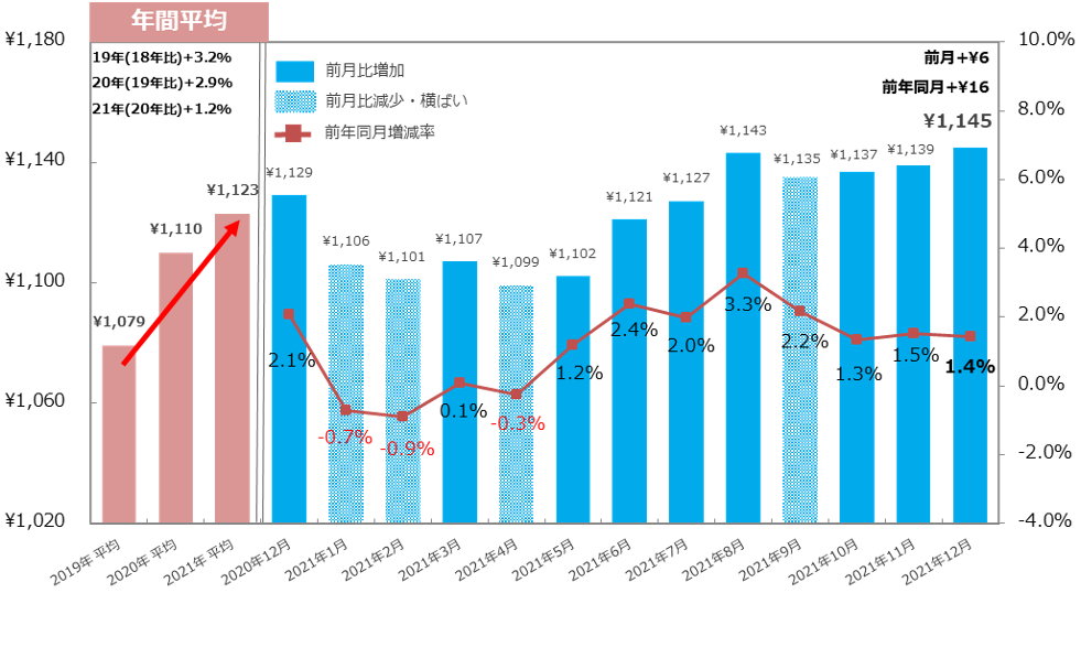 12月の全国平均時給は1,145円(前月1,139円、前年同月1,129円)、前月比・前年同月比ともに増加