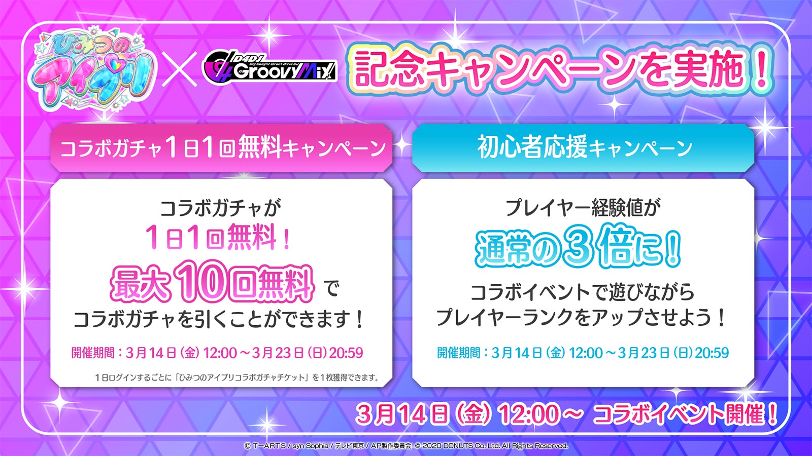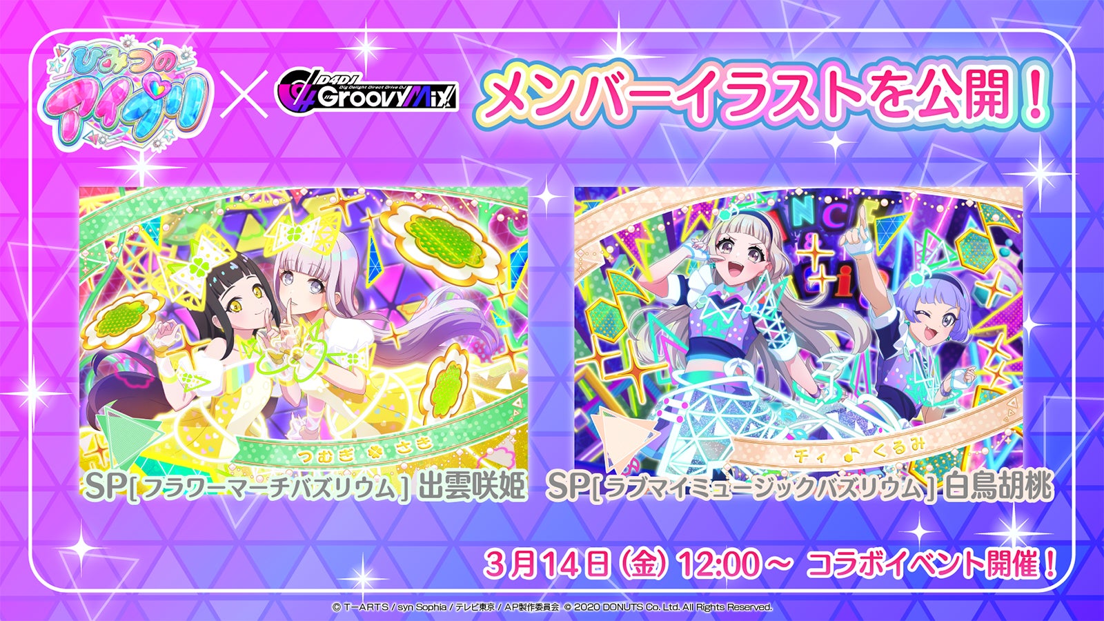 株式会社DONUTS(本社:東京都渋谷区、代表取締役:西村啓成)は、スマートフォン向けリズムゲーム「D4DJ Groovy Mix」(以下グルミク)にて、『ひみつのアイプリ』とのコラボイベント&ガチャ「ひみつのアイプリ × D4DJ -ひみつのアイプリDJ!?-」を3月14日(金)12:00より開始いたします。