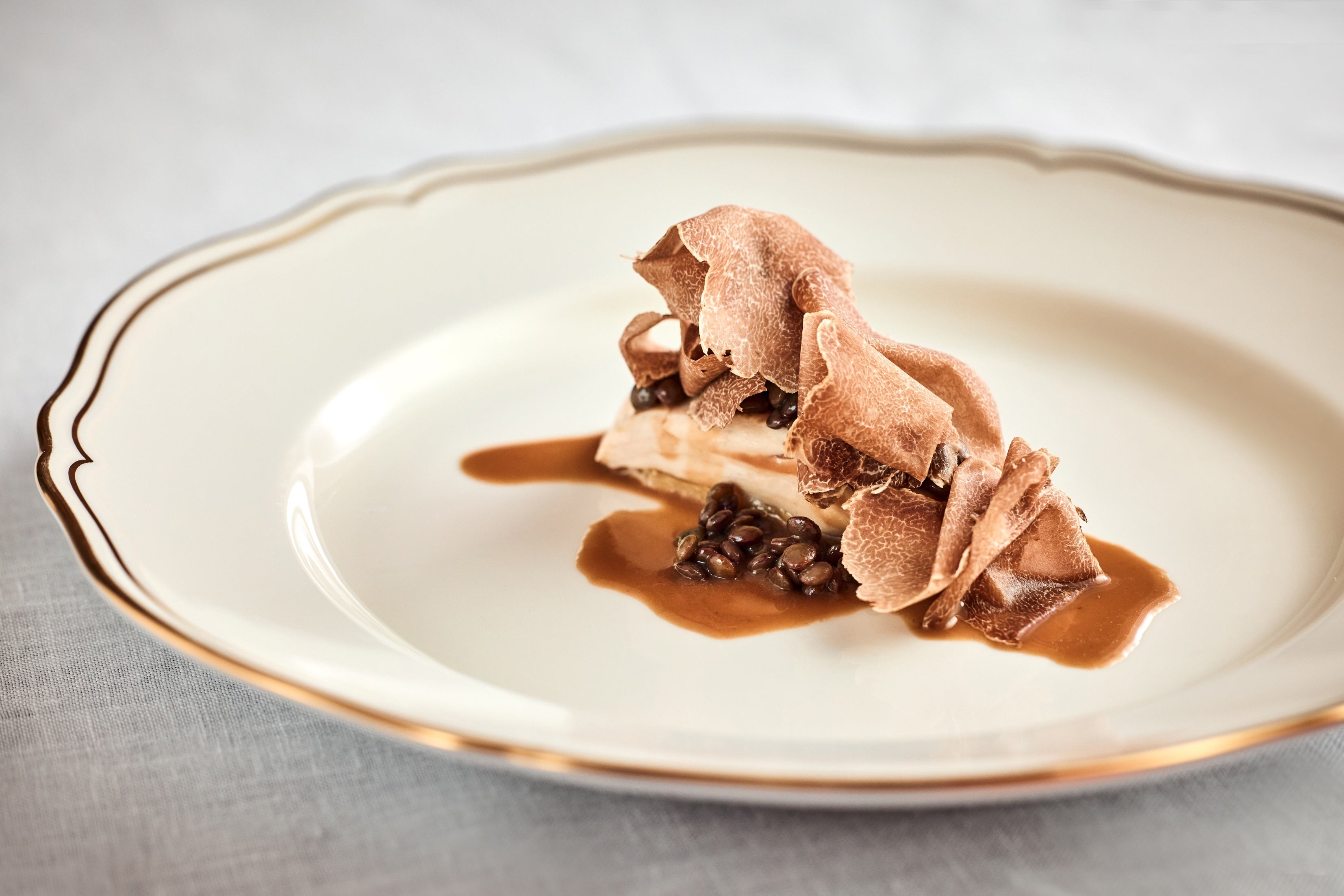 長崎で採れた天然クエの繊細な味わいと脂の乗りにインスピレーションを得た新しい料理は、その身をジューシーに仕上げる調理法によって作られています。軽やかなネギのソースと煮込んだネギが添えられ、とっておきの白トリュフをさりげなく引き立てます。
