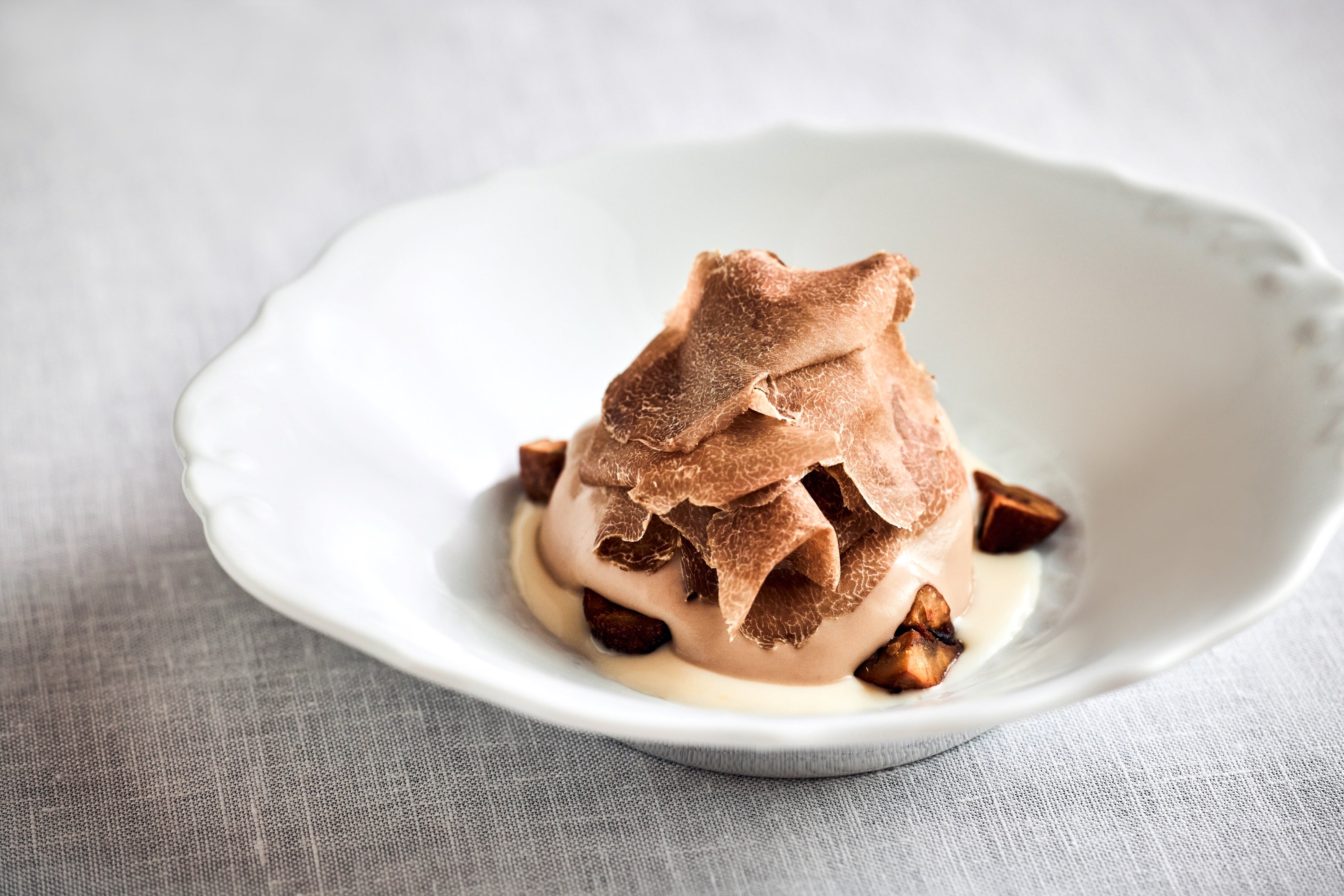 白トリュフの季節にニコ・ロミートがお届けする新たな定番のひとつ。伝統的な秋の食材と風味を組み合わせ、通常はセイボリーにのみ取り入れられる白トリュフが思いがけない味わいと美しいフレーバーの調和を生み出します。甘い柿やスパイスの効いたパン、クリーミーなアーモンドムースと出逢い、白トリュフが予想外の美味しさを届ける驚きと喜びのデザートです。
