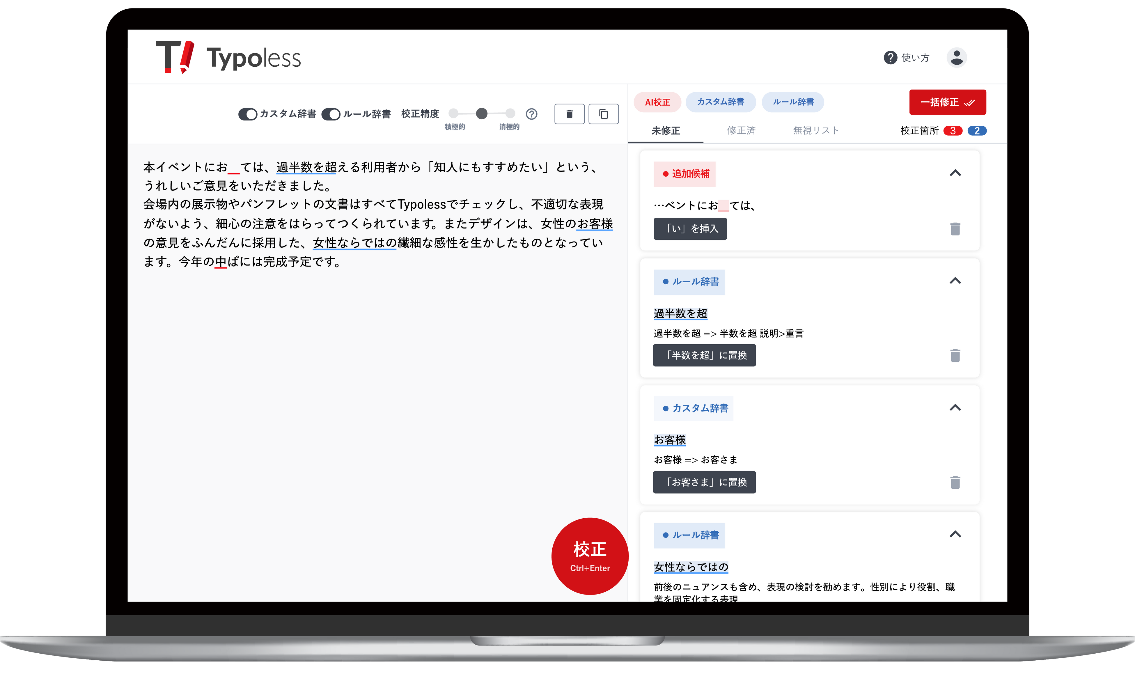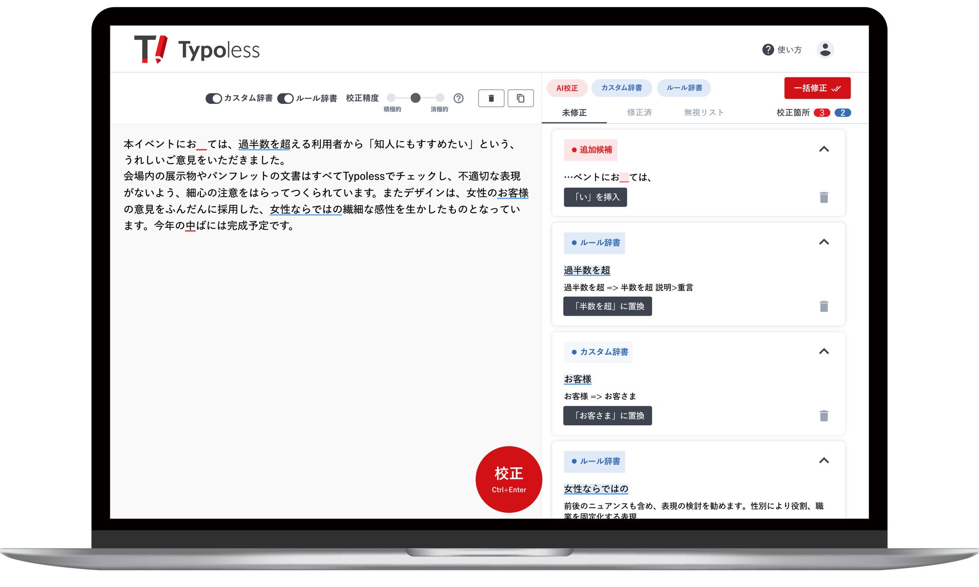 わかりやすいUIで直感的に、スピーディーに校正できます。
