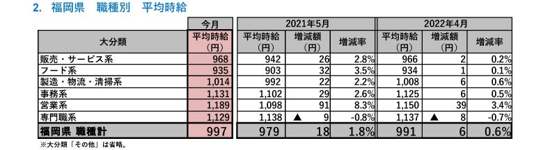 [福岡県版]2022年5月度 アルバイト・パート募集時平均時給調査 福岡県の5月度平均時給は前年同月より18円増加の997円