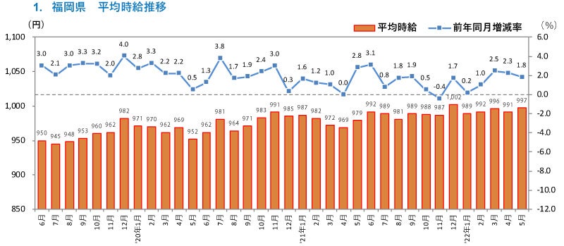 ■ 福岡県の平均時給は997円(前年同月979円、前月991円)