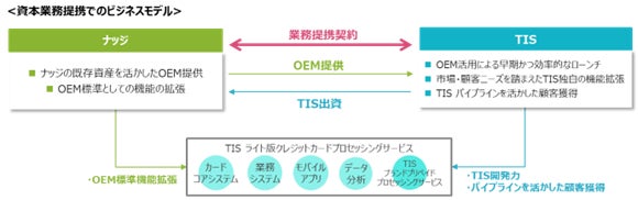 今回の資本業務提携契約締結により、ナッジはTISをOEM※1標準パートナーに採択し、ナッジで構築・展開しているスマホネイティブな次世代クレジットカード「Nudge」のシステム基盤をTISへ提供します。TISは、ナッジより提供されたシステム基盤にTIS独自の機能拡張を加え「ライト版クレジットカードプロセッシングサービス」としてクレジットカード会社及びクレジットカードの発行を検討する企業へサービスを展開します。
