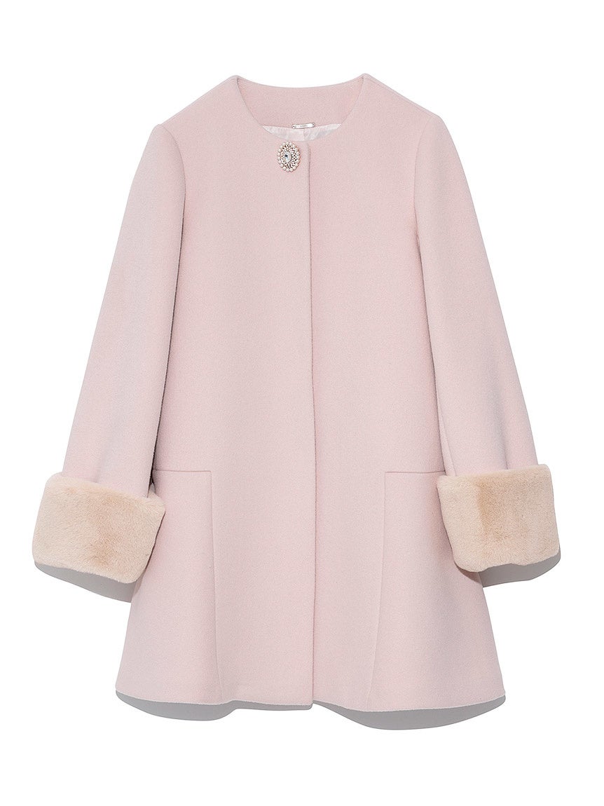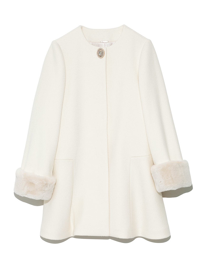 襟元に大きめのビジューブローチを施し、華やかな印象とふんわりと立体的なシルエットのフレアコート。