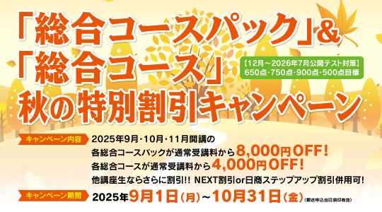 TOEIC対策講座を展開しているTAC株式会社(東京都千代田区、代表取締役:多田敏男)は、2025年9月1日(月)から10月31日(金)まで、TOEIC対策の秋の特別割引キャンペーンを実施します。