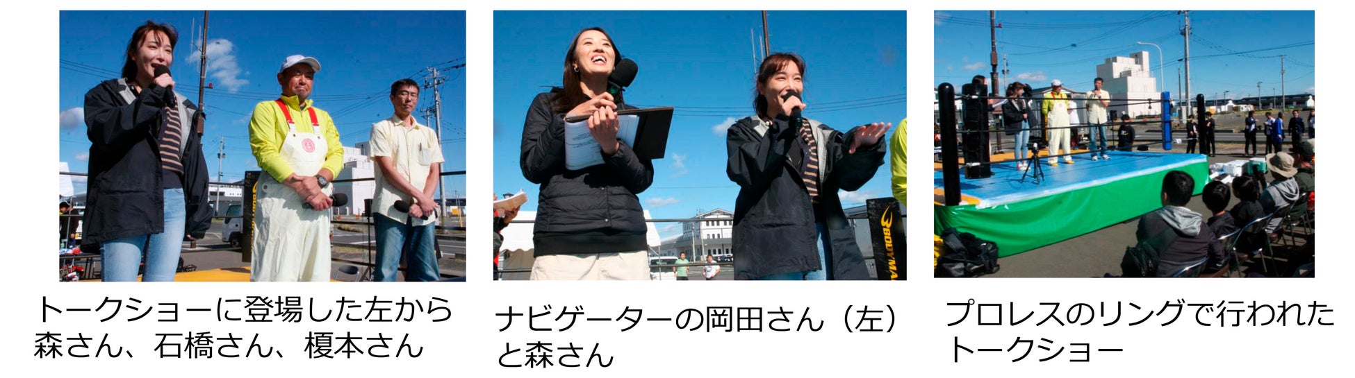 【トークショー】表彰式の後には、リング上で福島の海の魅力について語るトークショーが行われ、YouTubeチャンネル「魚屋の森さん」で魚のおいしさを発信している森朝奈さん、地元の漁師で相馬双葉漁協原釜地区青壮年部長の石橋正裕さん、福島県水産海洋研究センター主任研究員、榎本昌宏さんが登壇。森さんは「『常磐もの』の魚はさばいてみて、どれも外れがない。もっとたくさんの人に食べてもらえるよう、おいしさを発信していきたい」と話した。「初心者がこれほど大きなヒラメを釣れる場所は日本中探してもどこにもない。たくさんの人に福島に来てもらい、盛り上げてほしい」と、石橋さん。榎本さんは「福島県ではどこよりもしっかりと検査をしているので、安心して福島のおいしい魚を食べてほしい」と、安全性について語った。